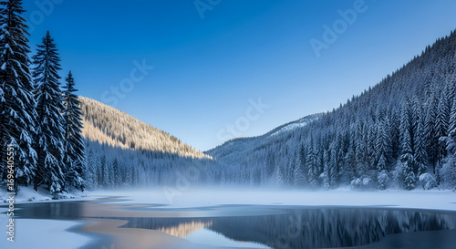 Fototapeta premium Winter Mountain Landscape with Frozen Lake, Snow-Covered Pines, and Bright...