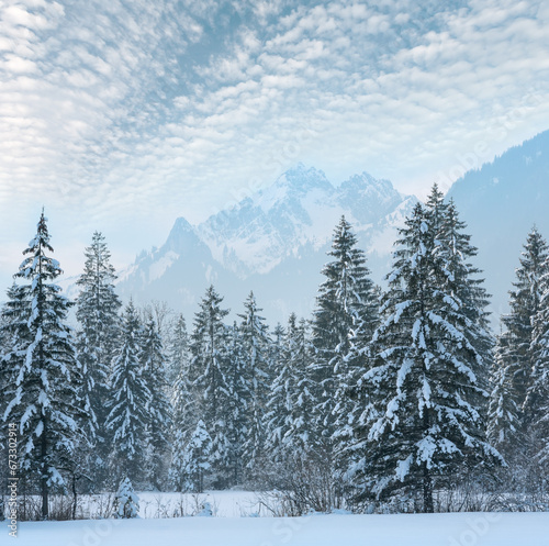 Fototapeta premium Winter mountain landscape with snowy fir forest.