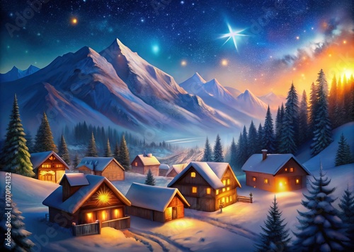 Fototapeta premium Winter Mountain Village Night Bokeh AI Art, Magical Mountain Scene