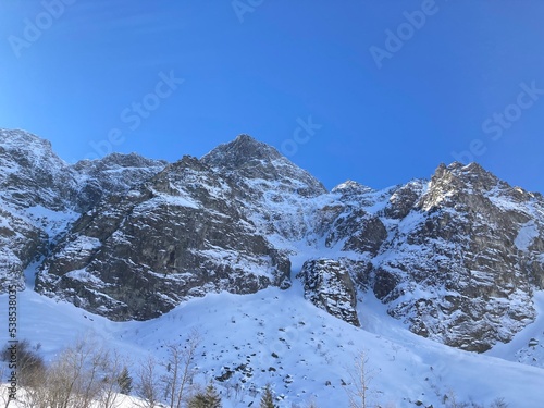© Adam, Fototapeta premium Winter mountains with snow in the winter rocky landscape. Winter nature landscape with mountains, trees, forest, plants and blue sky with clouds and sun. Hiking in the mountain with snowy path.