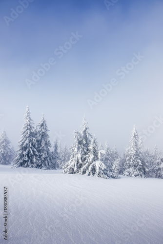 © encierro, Naklejka premium Winter natural background. Foggy mountain forest with snow covered frozen trees. Cold weather in frosty landscape