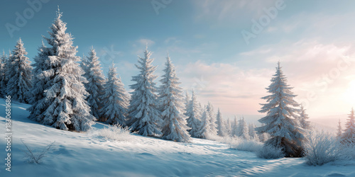 Naklejka premium Winter nature background with snow-dusted evergreens and serene horizon, crisp winter clarity, calm balanced proportions, gentle atmospheric softness