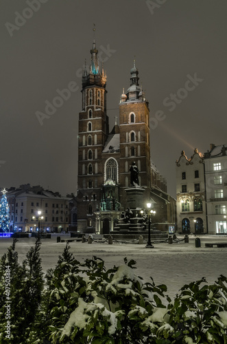 Naklejka premium Winter night in Cracow marketplace, view to St. Mary's Church