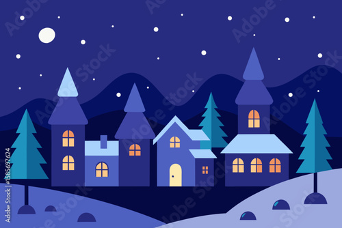 Fototapeta premium winter night in decorated village snowflakes fall.svg