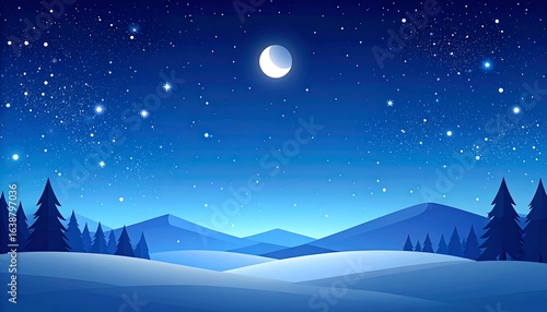 © nurman, Fototapeta premium Winter night landscape with stars and a crescent moon.
