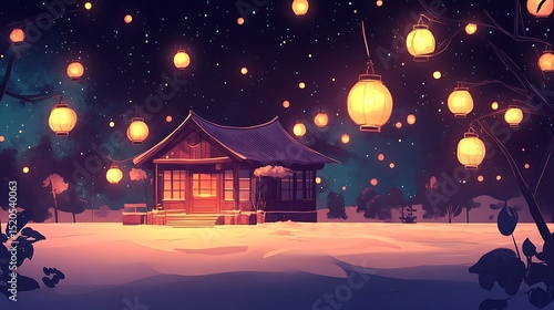 © Aodne, Fototapeta premium Winter night scene with a small house and lanterns.