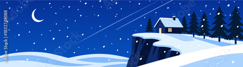 Fototapeta premium Winter night scene with house and pine trees on snowy slope