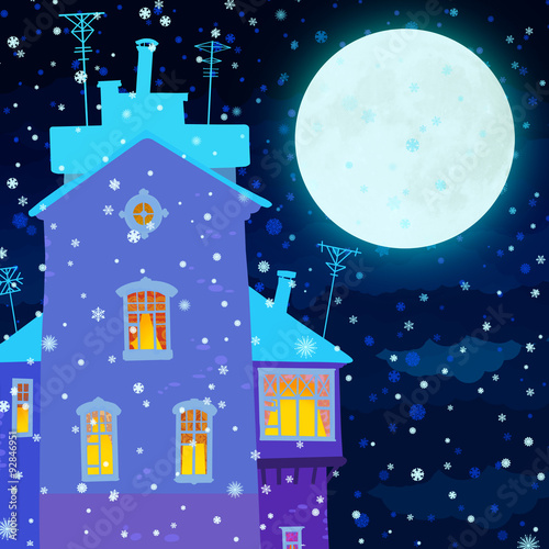 Fototapeta premium Winter night, square image house and moon in the night sky and s