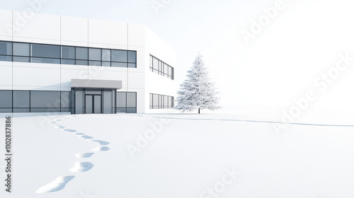 Obraz premium Winter Office Landscape: Snow covered ground with footprints leading to a modern, minimalist office building. A lone snow-covered evergreen stands beside the entrance.
