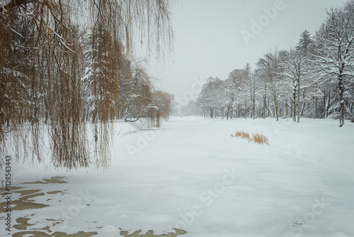 © Roman, Fototapeta premium Winter park. View of the frozen canal