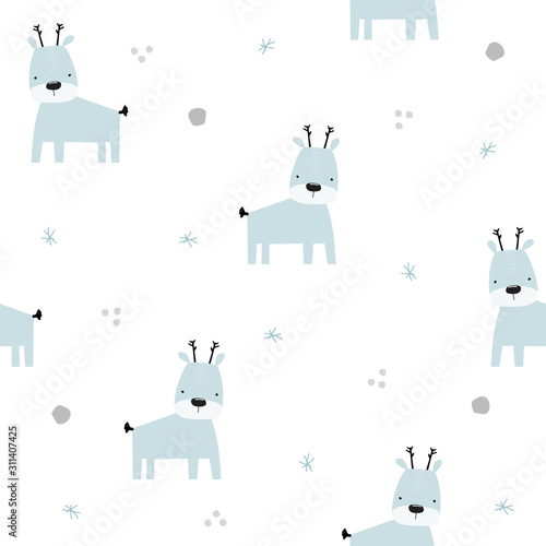 Obraz premium Winter pastel seamless pattern with little reindeer. Childish simple print. Vector hand drawn illustration.