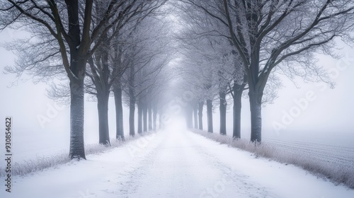 © Bernardo, Naklejka premium Winter Pathway: A Snow-Covered Road Lined with Bare Trees in a Serene Landscape