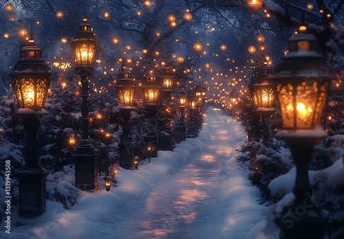 © MicroTech, Obraz premium Winter Pathway with Glowing Lanterns and Falling Snow