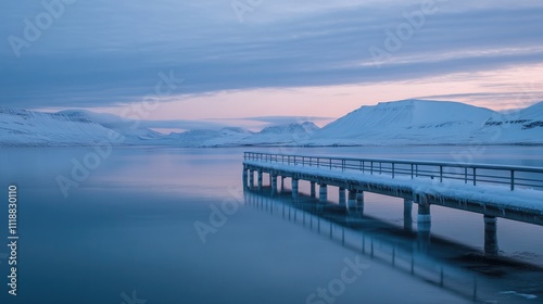 Obraz premium Winter Pier Snow Covered Mountains Peaceful Fjord