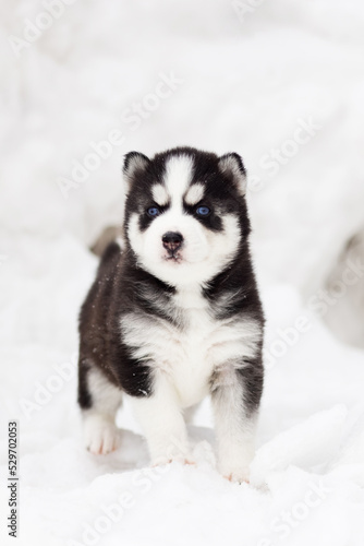 Obraz premium Winter portrait of a cute blue-eyed Siberian husky puppy, dog on the snow in...