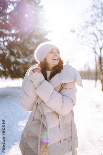 Obraz premium Winter portrait of a happy woman in a snowy park. Young woman in warm clothes...