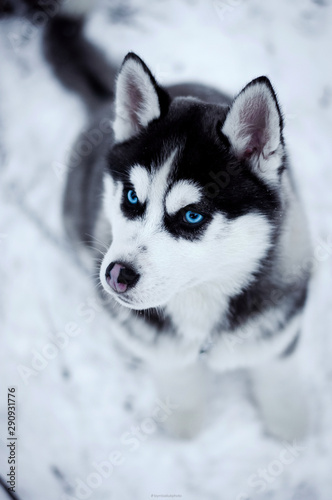 © Олександр Цимбалюк, Naklejka premium Winter portrait of a husky with blue eyes in the snow