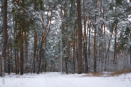 Fototapeta premium Winter quiet alley for healthy walks in a forest park among pines