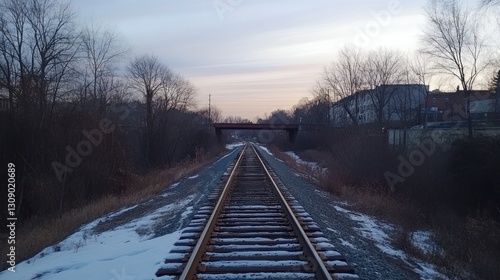 © Izza, Fototapeta premium Winter Railroad Tracks Leading to the Distant Town
