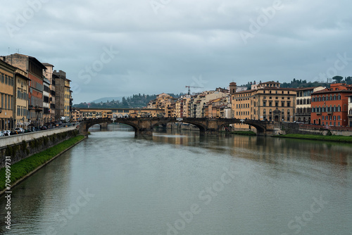 © Andrii Marushchynets, Obraz premium Winter rainy Florence. Bridges over the Arno River and Medieval Architecture.