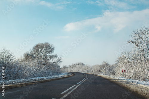 © dmf87, Fototapeta premium Winter road ahead. Frozen landscape with empty highway