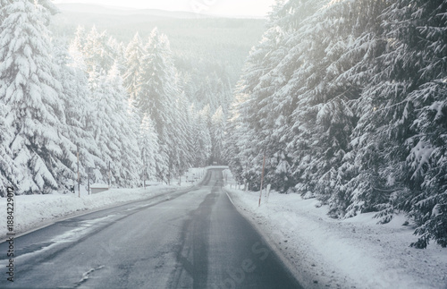 © Leon, Fototapeta premium Winter road trip through a snowy forest in Oberwiesenthal, Ore Mountains