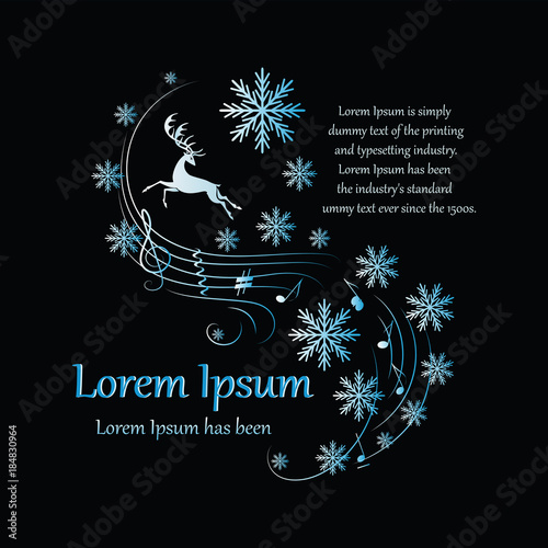 Obraz premium Winter. Running deer on a black background. Poster, a postcard with a deer, notes, snowflakes and a place for text. Design for the musical program of the New Year, Christmas concert.