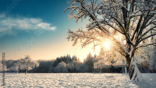 © Smileus, Fototapeta premium Winter rural wonderland landscape with golden sunlight, blue sky and a beautiful snow-covered tree on a field
