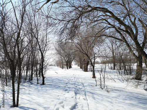 © Vladimir, Fototapeta premium Winter Russian forest landscape with trees in early spring, melting snow