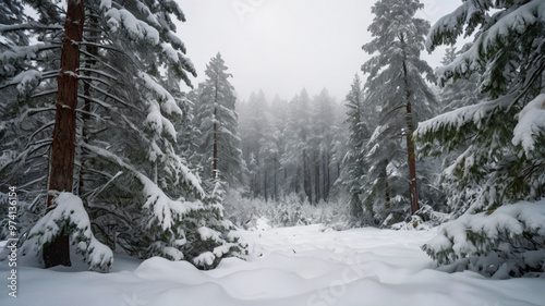 Naklejka premium Winter's blanket over majestic mountains and pine forests, where snow-dusted...