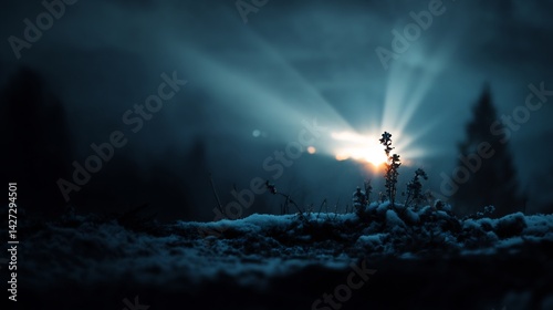 © Anjar Stock, Obraz premium Winter's Breath: Sunlight Piercing Through the Mist on a Frozen Landscape