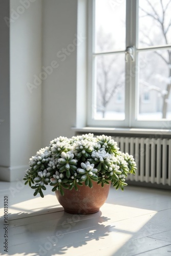 Fototapeta premium Winter's Embrace A frost-kissed succulent in a terracotta pot basks in the sunlit warmth of a bright room, a peaceful indoor scene.