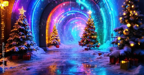 Fototapeta premium Winter scene depicts colorful tunnel decorated with Christmas trees, gifts, snow. Bright lights create magical atmosphere.