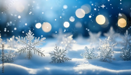Naklejka premium winter scene featuring soft snowflakes on shimmering snow with a tranquil blue background and gentle bokeh effect