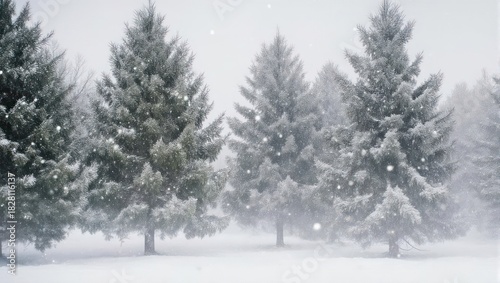 Naklejka premium Winter scene of frosted evergreen trees with falling snowflakes in a snowy...
