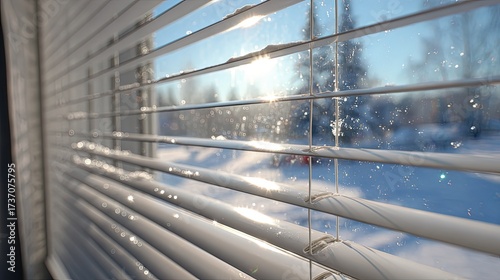 Fototapeta premium Winter Scene Through White Venetian Blinds