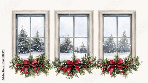 Fototapeta premium Winter scene with three windows adorned with festive decorations, evoking...