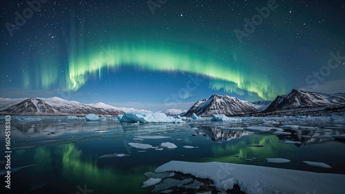 Naklejka premium Winter scenery featuring shimmering aurora and frozen coastal waters under...