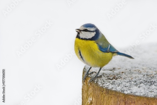 © Tunatura, Naklejka premium Winter scenery with blue tit bird sitting on the snowy stump (Cyanistes caeruleus)