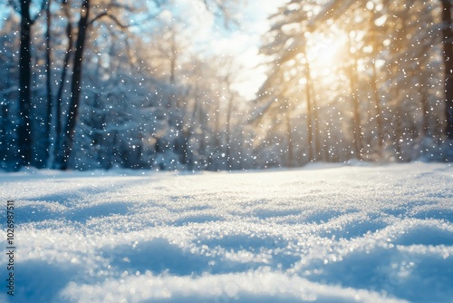 © dendyh7, Naklejka premium Winter season background in white snow landscape
