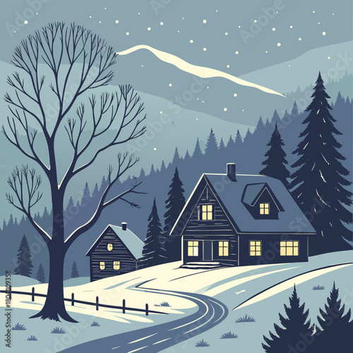 © art vector, Naklejka premium Winter season night landscape with village under the snow in the first plan, mountains and forest in the background. Hand drawn vector illustration. Can be used for christmas gifts, decorations.