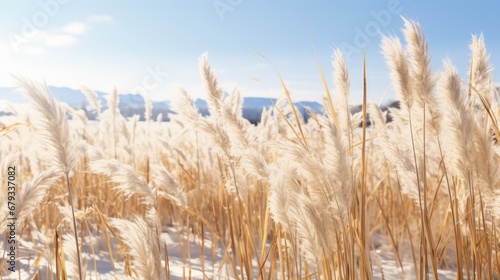 Fototapeta premium winter serenity: Tall dried crops under the snow.