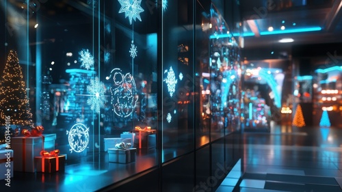 © Fxquadro, Fototapeta premium Winter shopping mall with neon snowflakes and gifts.