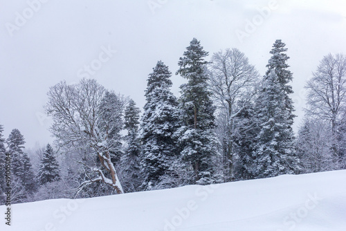 Naklejka premium Winter snow-covered forest in the mountains, majestic slopes in snow captivity.+