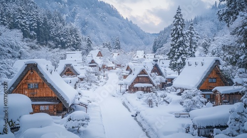 Naklejka premium Winter Snow-covered Village at Night with Warm Glowing Lights