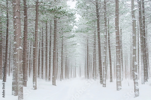 © Bougie Banana, Fototapeta premium winter snow dusted pine forest at wellness retreat