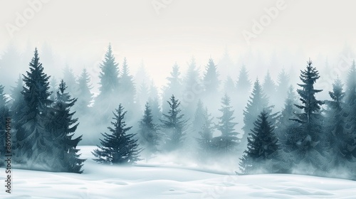 © valiantsin, Naklejka premium Winter snow nature. Christmas landscape cold seasonal background. Frost in forest tree. Holiday sky with white blue snowy. Xmas mountain fir beauty. Snowfall scene spruce travel.