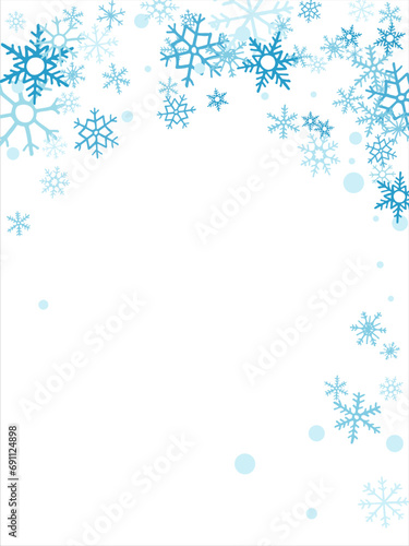 © Alena, Fototapeta premium winter snow with blue snowflakes on a white background. Festive Christmas banner, New Year card. Symbols of frosty winter. Vector illustration.