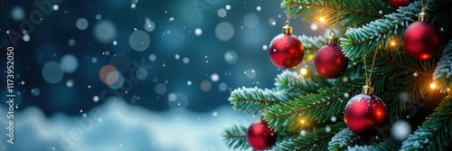 Fototapeta premium Winter snowflakes falling on a Christmas tree with colorful decorations,...