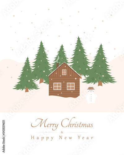 © talirie.design, Naklejka premium Winter snowy landscape with house, forest and snowman